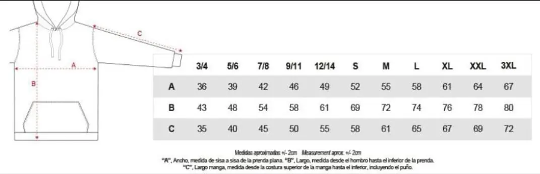 Talla | 3/4, 5/6, 7/8, 9/11, 12/14, S, M, L, XL, XXL, 3XL |